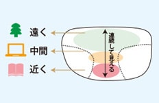 特性:中近両用レンズよりも更に手元の視野が広く、手元専用レンズよりも奥の方まで見えます。