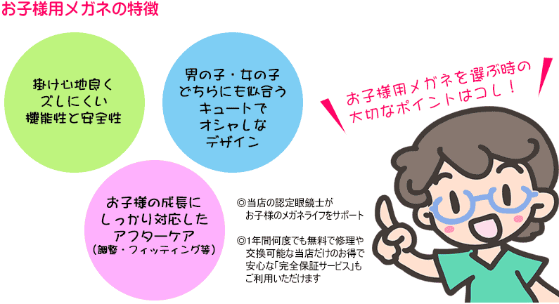 お子様用のメガネは単にサイズが小さいだけでなく、丈夫で安全であることが求められます。当店では、お子様専用に設計された機能性・安全性、そしてオシャレを兼ね備えた「お子様用メガネ」を多数取り揃えています。