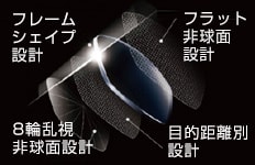 従来からある「球面設計」、ゆがみを減らしレンズの厚みを薄くする「非球面設計」、さらに性能・薄さを向上させた「両面非球面設計」、よりカスタマイズされたオーダーメイド非球面設計があります。