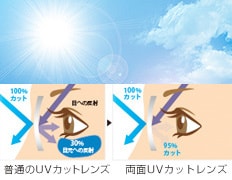 さらに紫外線対策を強化したい場合には、レンズ裏面に反射する紫外線をカットするワンランク上のUV対策コーティング<両面UVカットレンズ>があります。